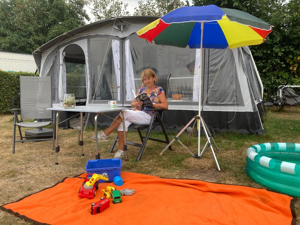 Voor de caravan staat een opblaasbadje en in de voortent staan wat dozen speelgoed. Ingrid: “Twee van onze kinderen wonen in Den Haag. De derde woont in Tilburg met haar partner en ons kleinkind, Lex van 3. Als trotse opa en oma passen we elke maandag en dinsdag op hem. Hij is heel graag bij ons op de camping. Van Ulvenhout is het een stuk minder ver rijden naar Tilburg. En van Den Haag zijn we in een uurtje hier.”