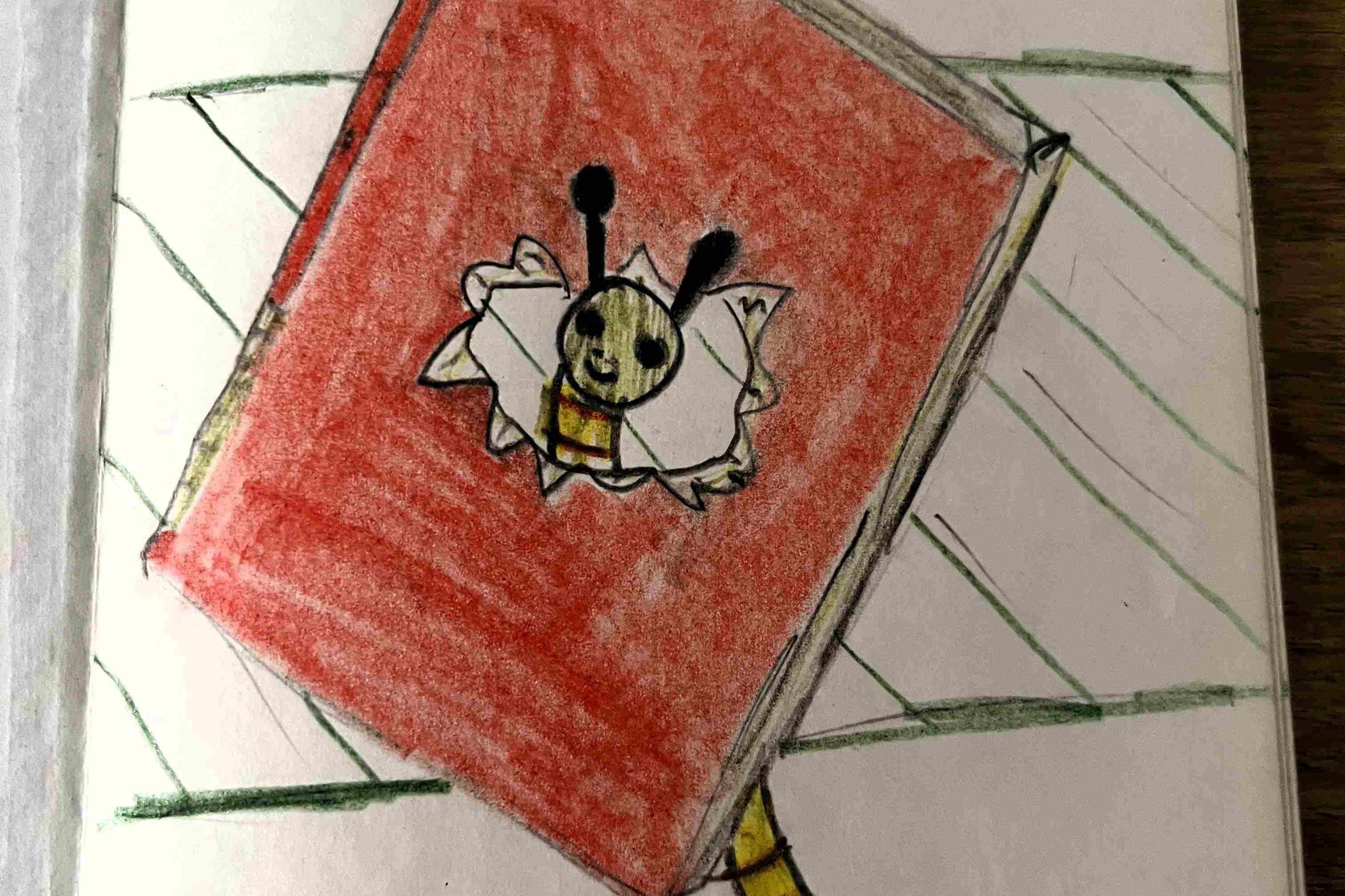 Van de week ging ik in mijn schatkist op zoek naar een foto van een familiefeestje uit de jaren 90. Mijn schatkist is een witte houten kist waar ooit een kerstpakket heeft in gezeten en waarin alles wat ik niet weg wil gooien maar ook geen echte bestemming voor heb, is beland. Tussen de foto’s, ansichtkaarten en toegangskaartjes voor concerten vond ik helemaal onderin een blauw opschrijfboekje. Ik herkende het direct, dat was het boekje van het schoolkamp. Op de eerste bladzijde stond de tekening van een boekenwurm. Niet helemaal hetzelfde. De voelsprieten was ik vergeten.